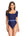 Mais tamanho azul impresso aberto volta um pedaço de fato de banho