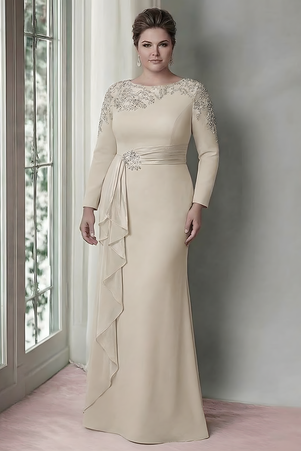 Vestido de mãe da noiva de cetim de mangas longas blush com folhos