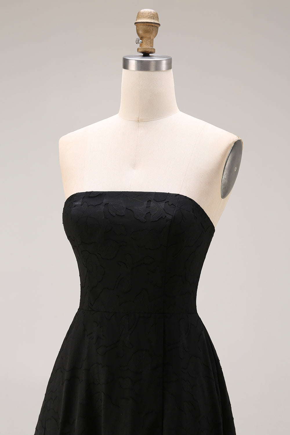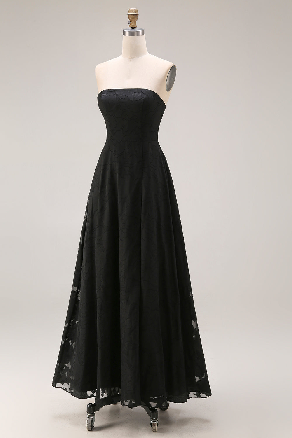 Vestido de Cerimónia Longo Preto Sem Alças Linha-A em Renda com Racha
