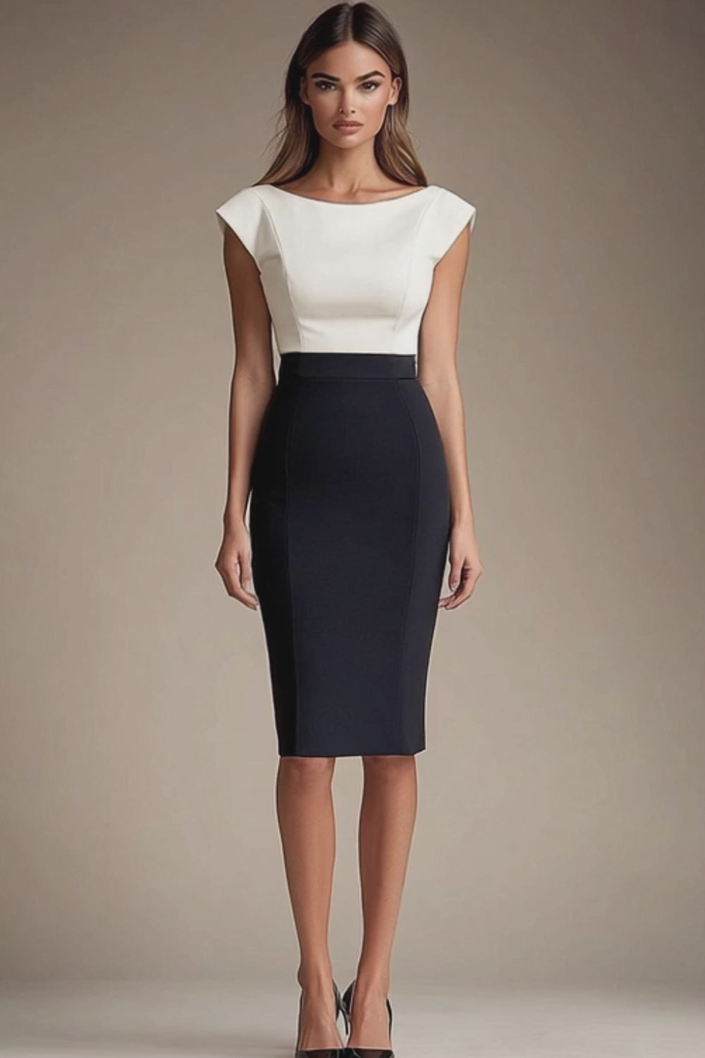 Preto Branco Bodycon Pescoço de Barco Midi Vestidos Cerimónia