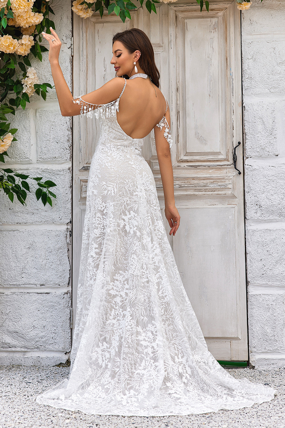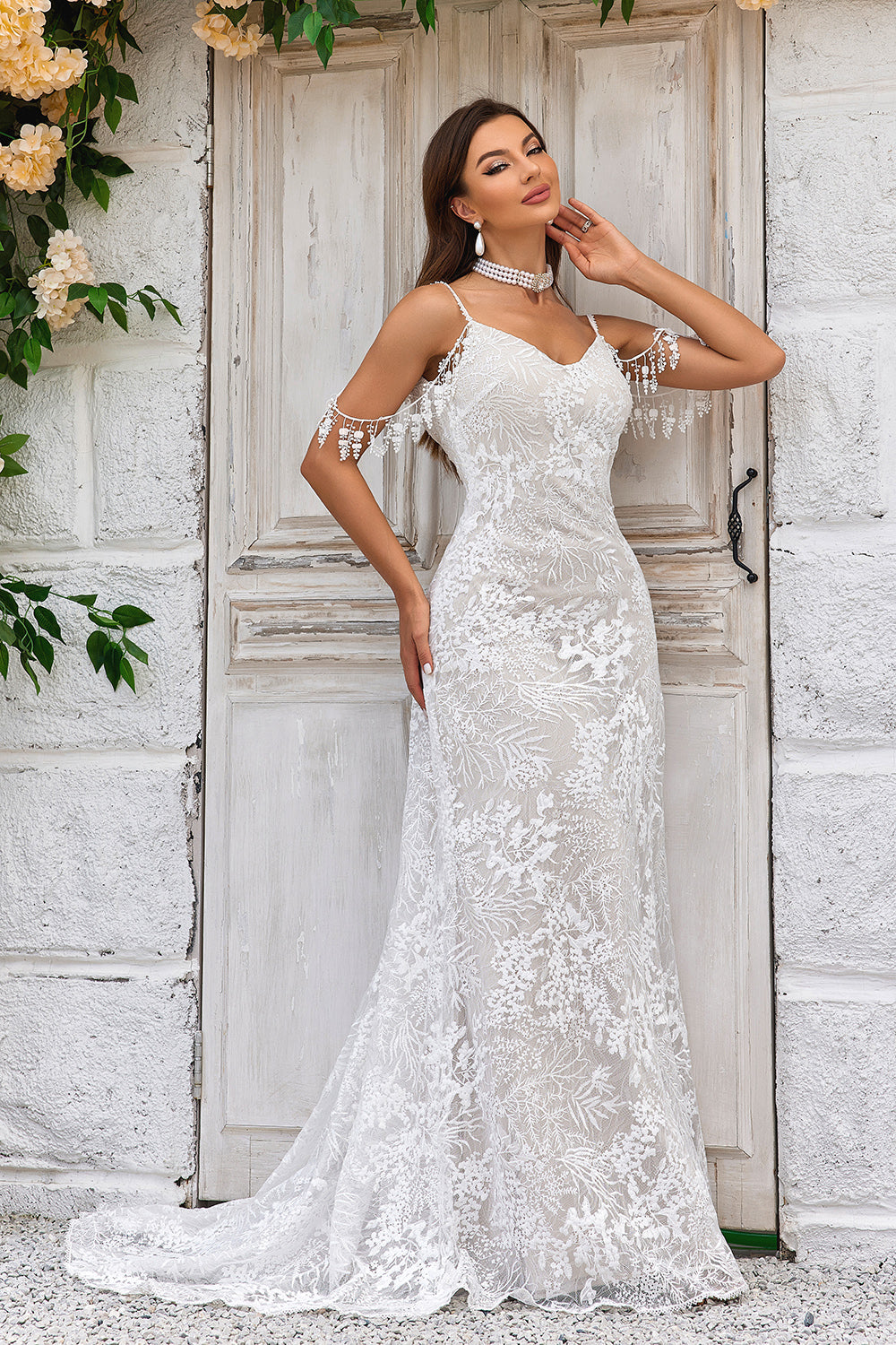 Sereia Cintas de Espaguete Marfim Vestido de Noiva com Franjas