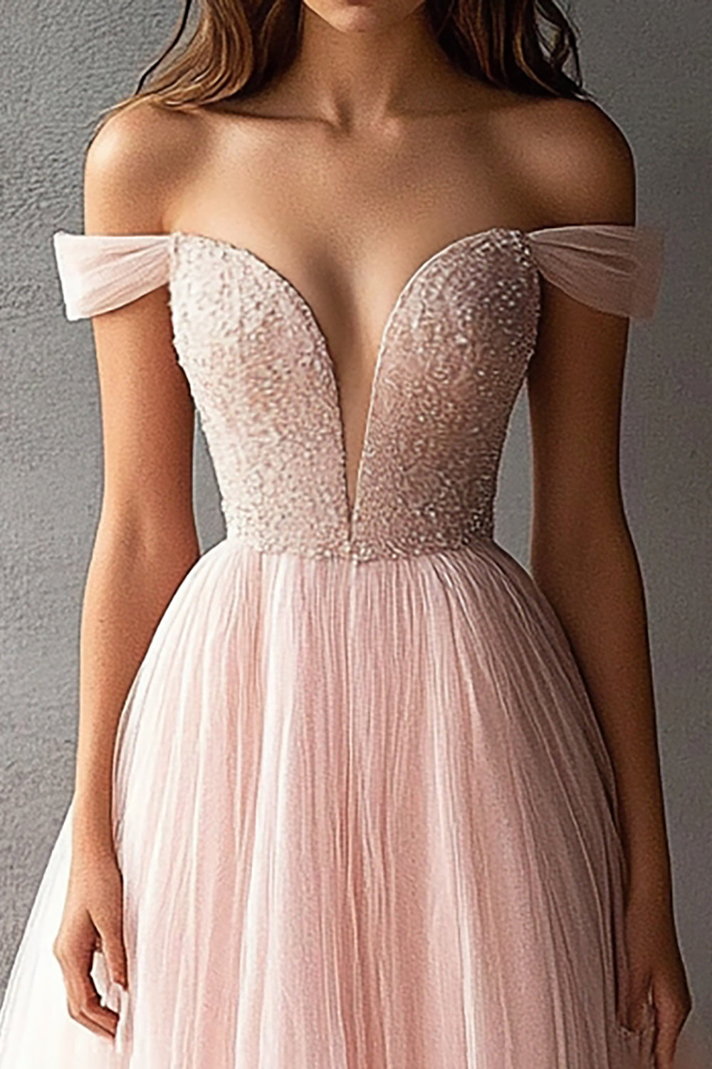 Tule Rosa Fora do Ombro Linha-A Longo Vestido de Baile