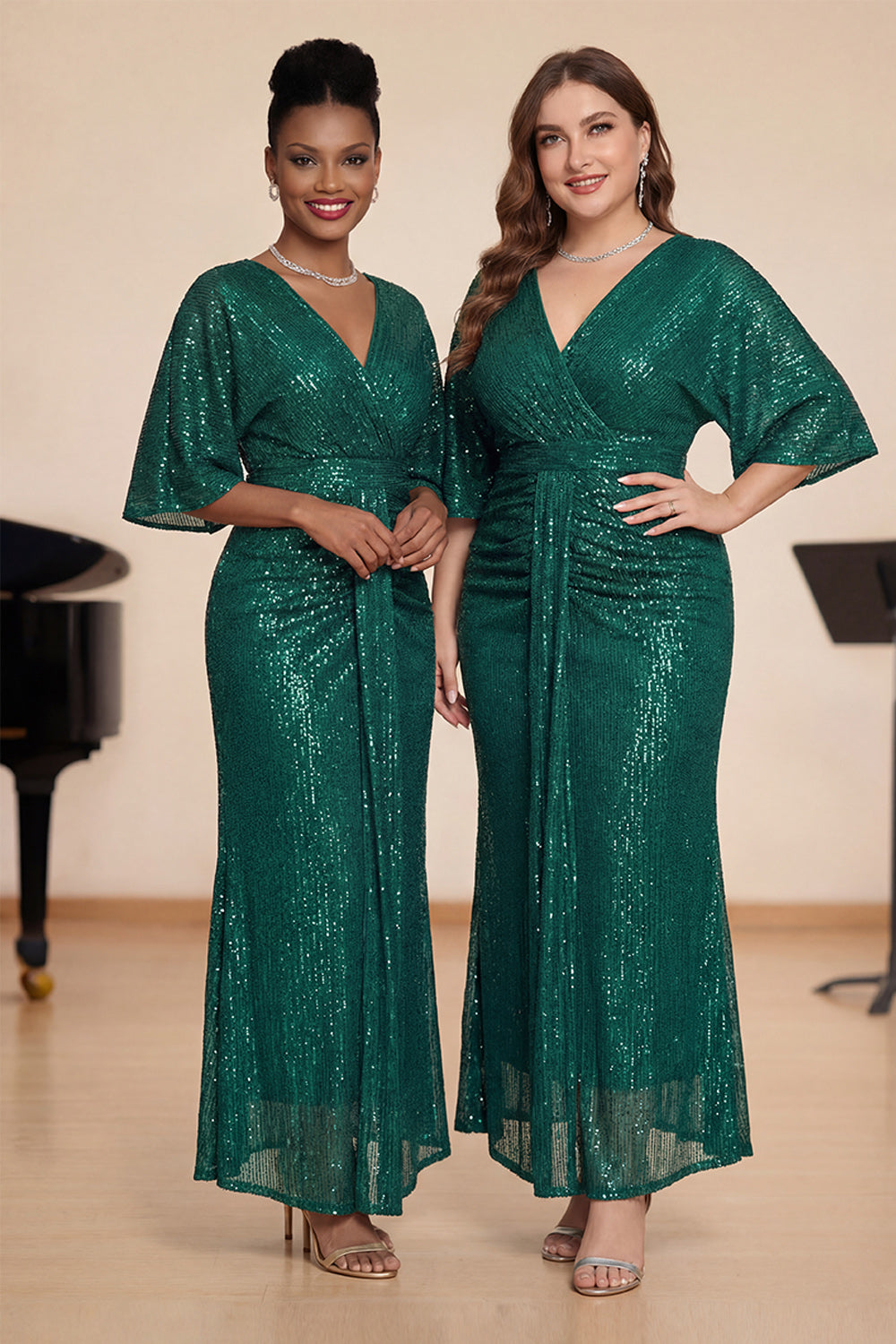 Vestido Coral Longo Verde Escuro Verde Escuro Brilhante e Franzido com Lantejoulas