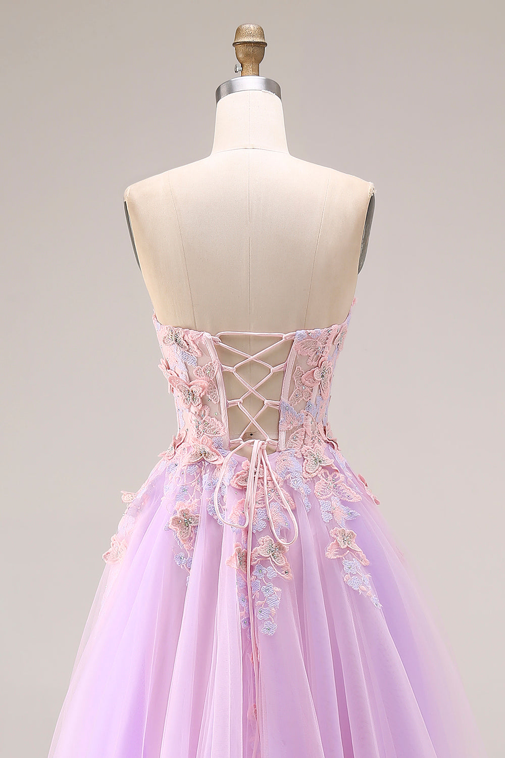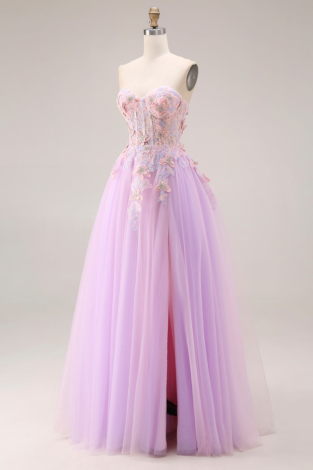 Vestido de Baile Longo A-Line Aplicado em Tule Lilas Decote Coração com Fenda