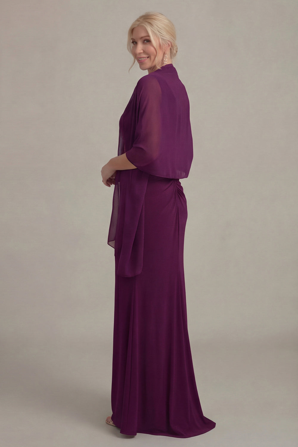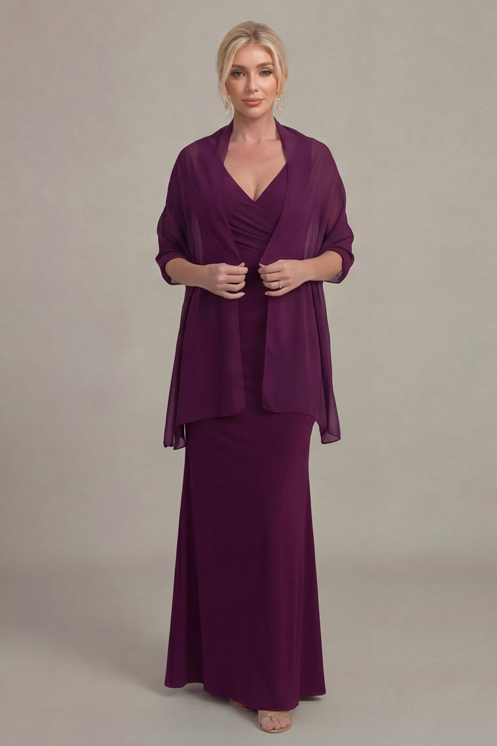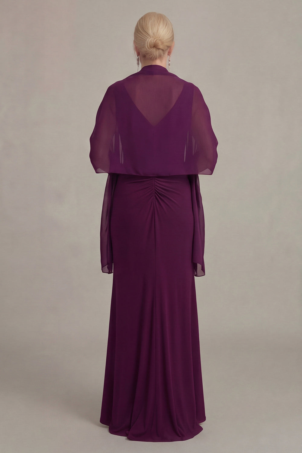 Vestido de Mãe da Noiva com decote V e Capa de Uva, Bainha de Uva