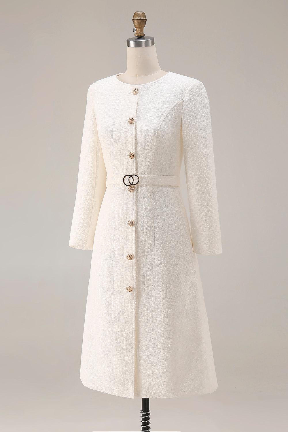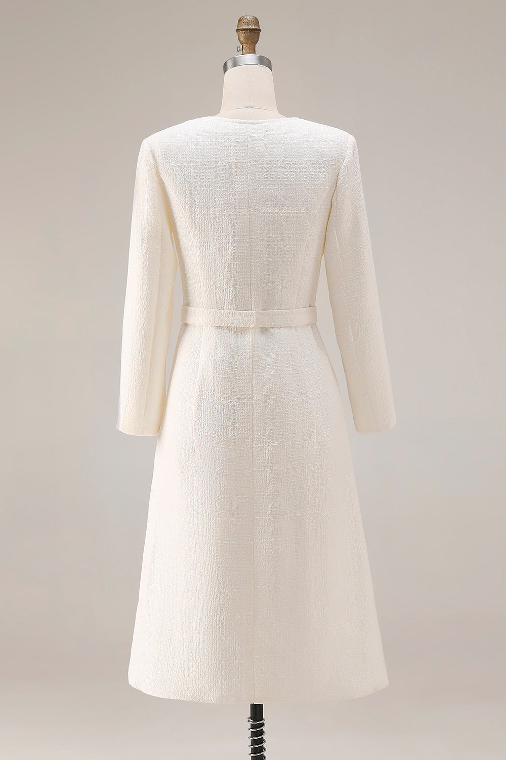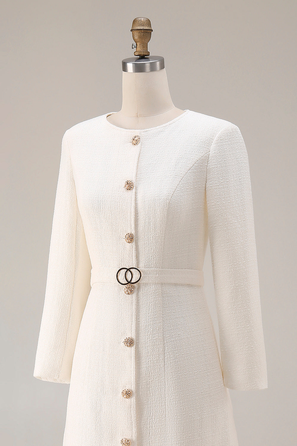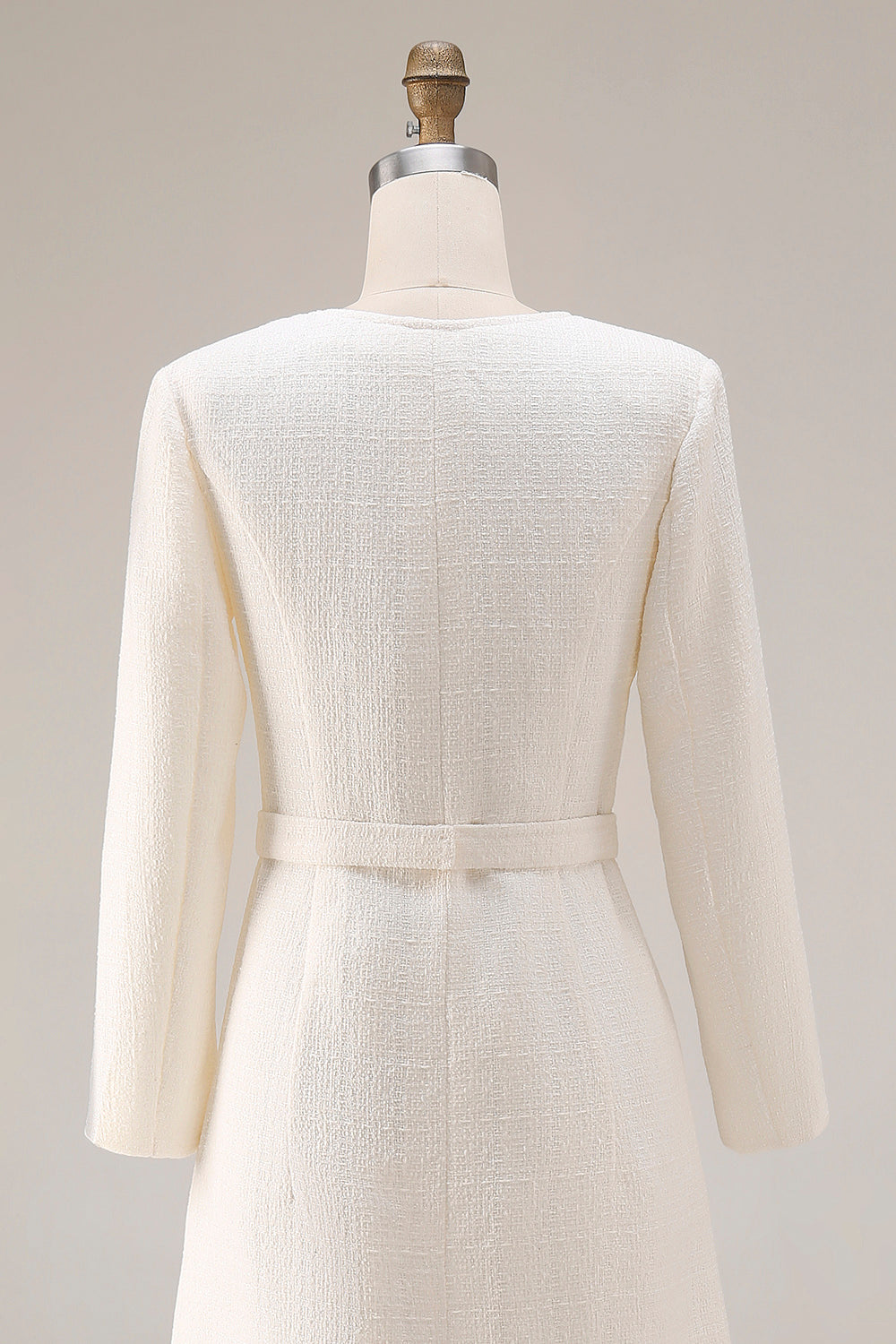 Vestido de trabalho midi de mangas compridas em tweed com bainha marfim e cinto