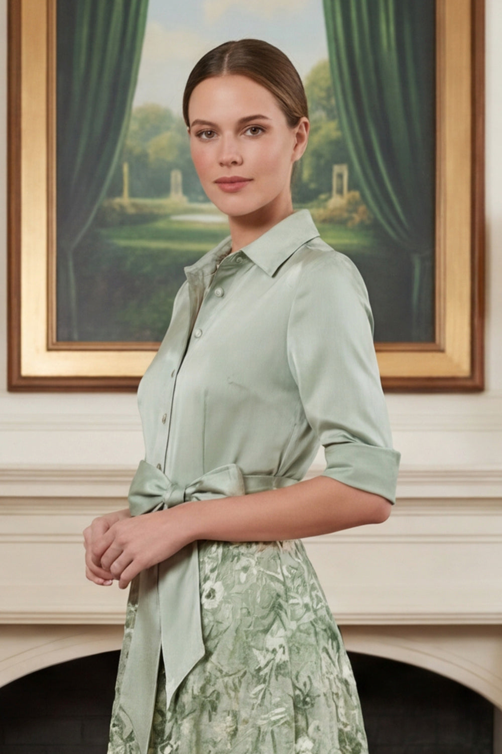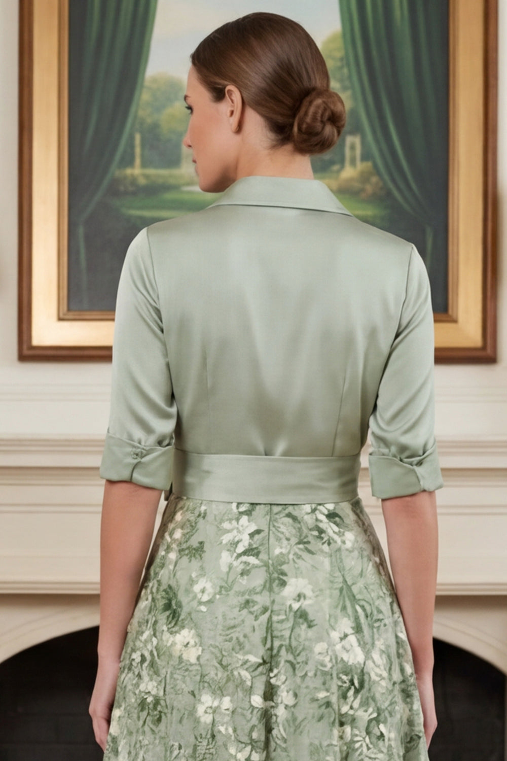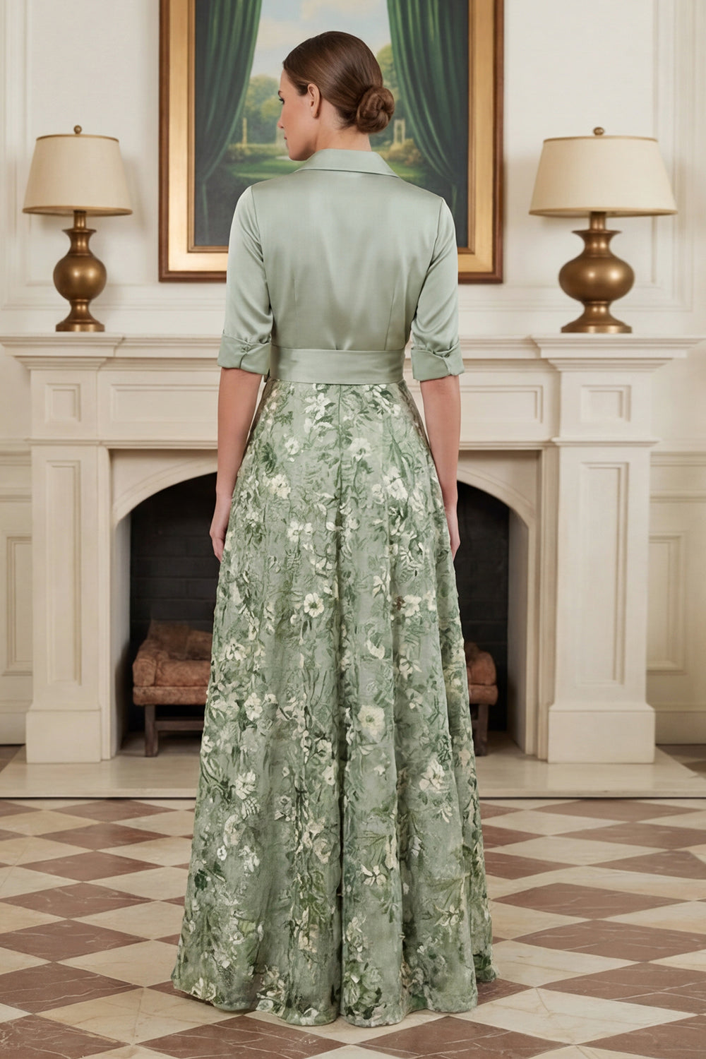 Vestido Mãe da Noiva Verde Sálvia A Linha Estampado com Laço